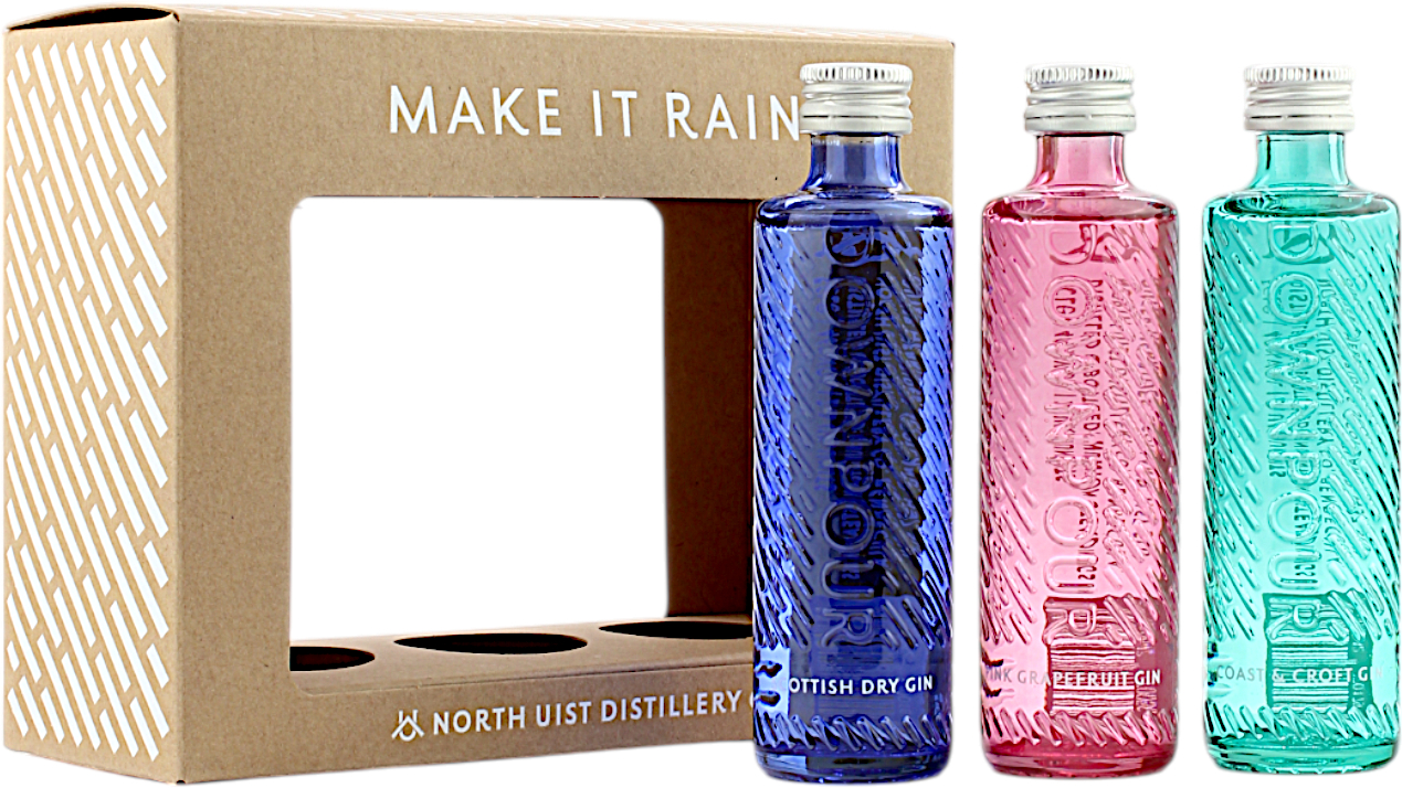 Das Downpour Gin Tasting Set von der North Uist Distillery bietet einen sehr guten Querschnitt durch das Gin-Angebot der Marke. Außerdem bietet es Einblick in neue Ginvariationen. Ein ideales Geschenk für Gin Kenner und Neulinge.